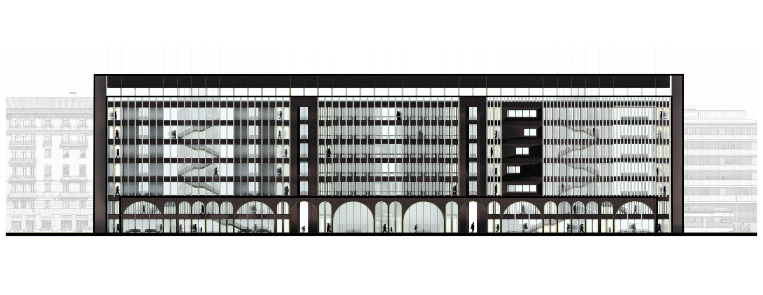 The project proposes a new architectural intervention built on the footprint of the existing Palazzo di Giustizia in Milan. Rather than preserving the building’s original spatial logic, the design reinterprets and reconfigures this monumental post-Fascist structure through a more democratic, transparent, and accessible architectural framework.